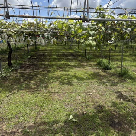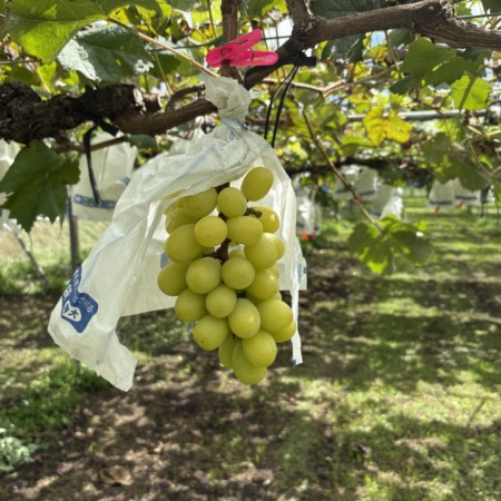 シャインマスカット(合志市) 2025/08/26 今回から、新しく使用された液肥のおかげか分かりませんが、去年より収穫量が増えて、大満足だそうです。 あと先日の大雨に関しては影響がほとんどなく安心でした。 農作物生育レポート一覧へ戻る